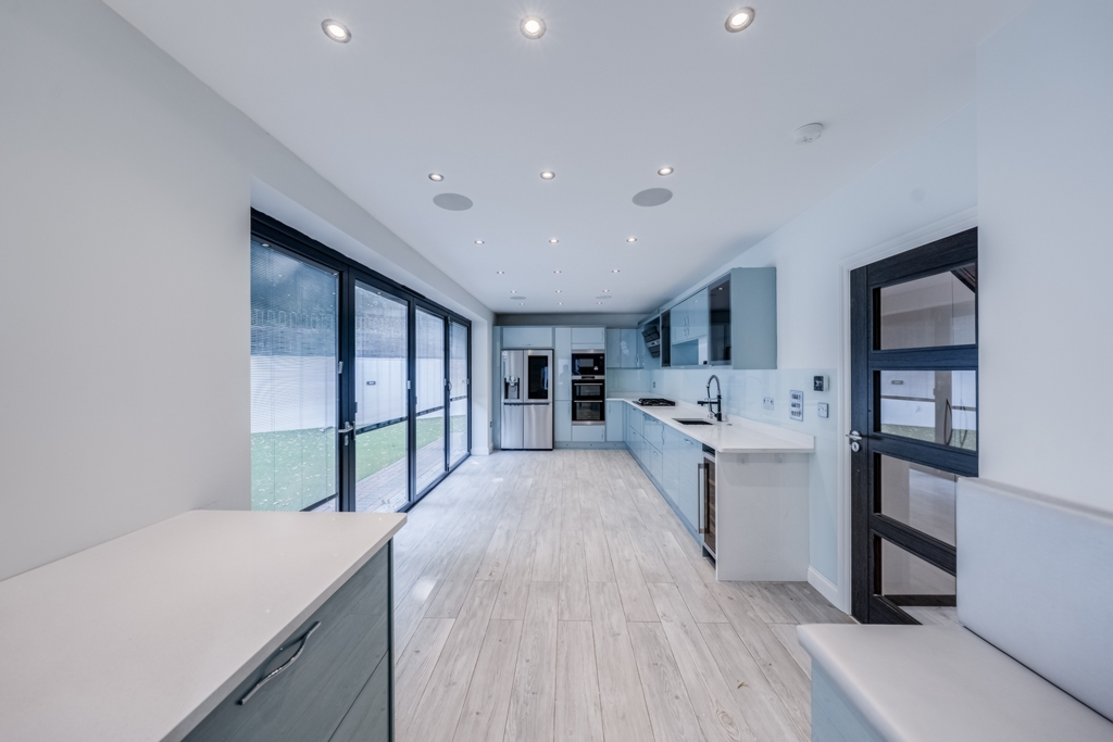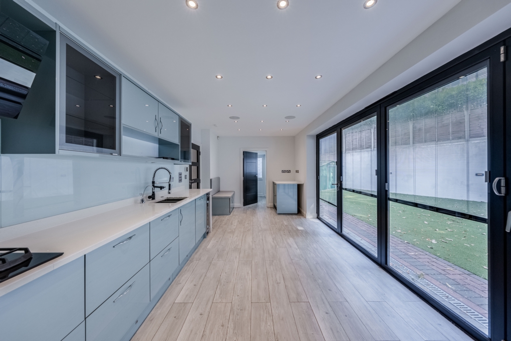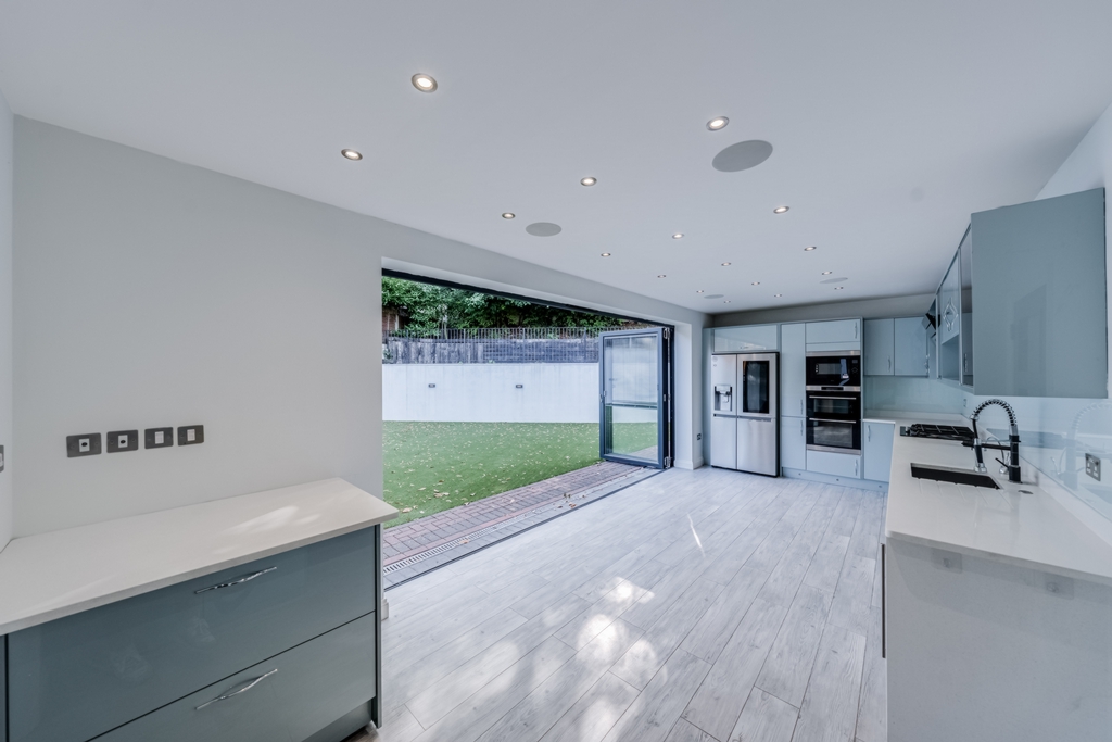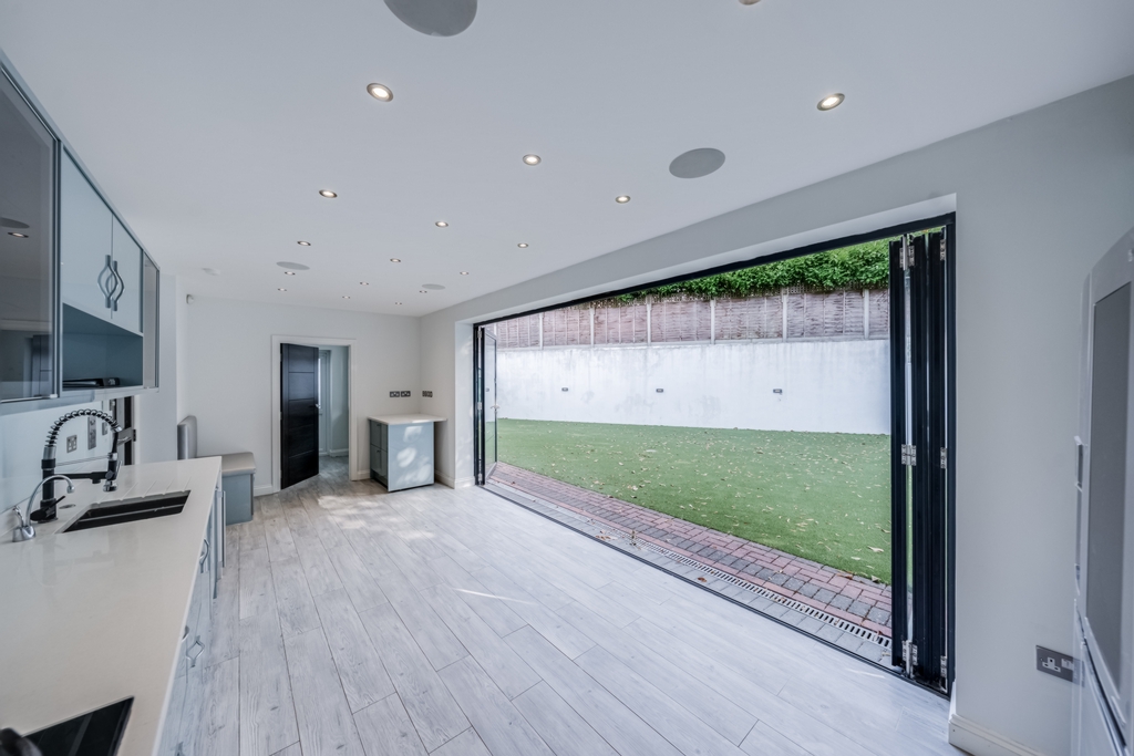 Spacious kitchen/diner with bi-folding doors into the garden, fully equipped with all appliances including American style Fridge Freezer, Wine cooler and Dishwasher.